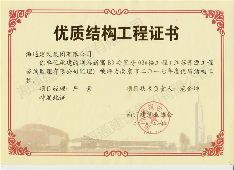 南京市優(yōu)質(zhì)結(jié)構(gòu)2017湖濱新寓B3安置房02#樓工程榮獲