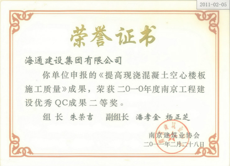 南京工程建設優秀QC成果二等獎