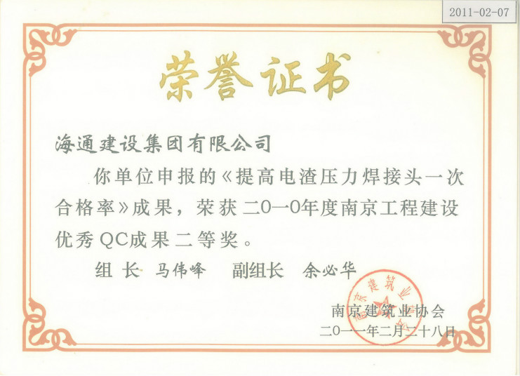 南京工程建設優秀QC成果二等獎