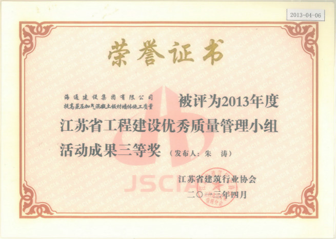 2103年度江蘇省工程建設(shè)優(yōu)秀質(zhì)量管理小組活動(dòng)成果三等獎(jiǎng)