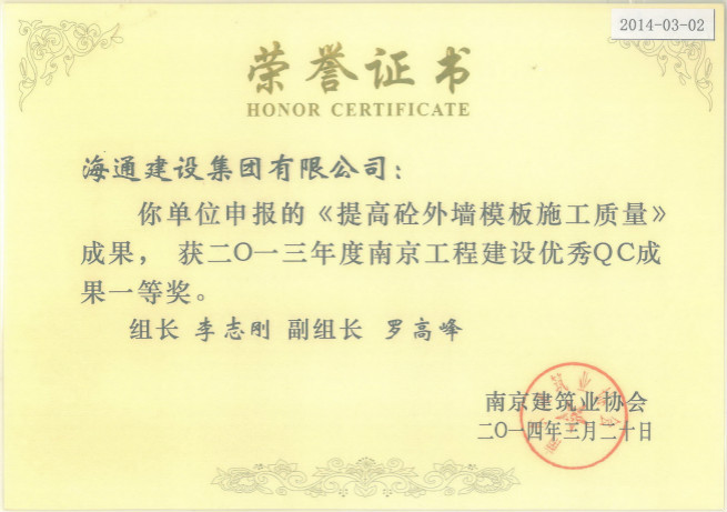 2013年度南京工程建設優(yōu)秀QC成果一等獎