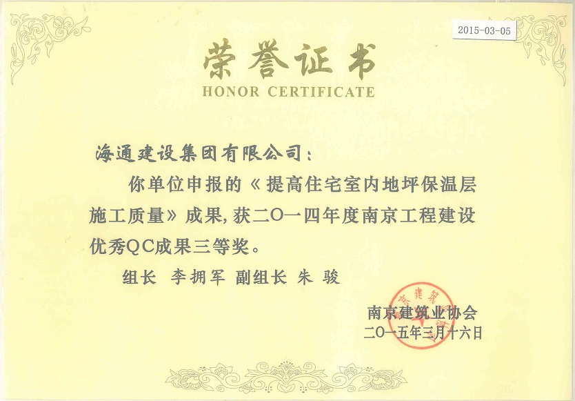 南京工程建設(shè)優(yōu)秀QC成果三等獎(jiǎng)