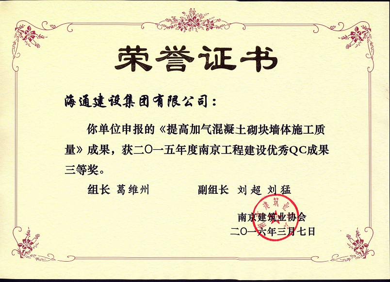 南京工程建設(shè)優(yōu)秀QC成果三等獎(jiǎng)