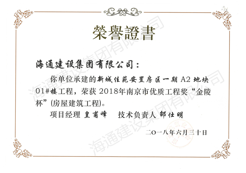 南京市金陵杯2018新城佳苑安置房區(qū)一期A2地塊01#樓工程