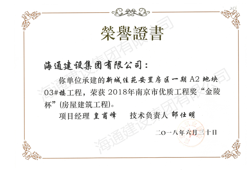 南京市金陵杯2018新城佳苑安置房區一期A2地塊03#樓工程