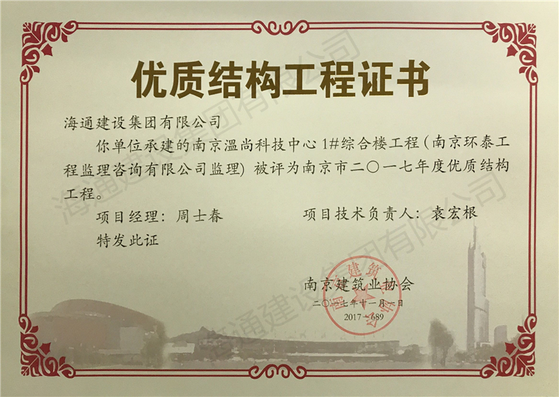 南京市優質結構2017南京溫尚科技中心1#綜合樓工程